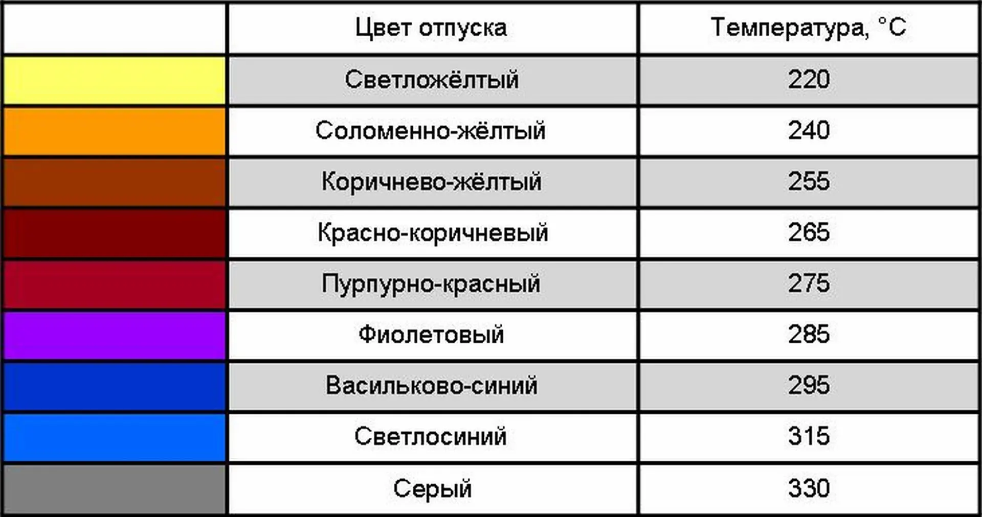 В таблице приведены цвета каления стали, соответствующие условиям обычного дневного освещения, и температуры нагрева, соответствующие этим цветам.