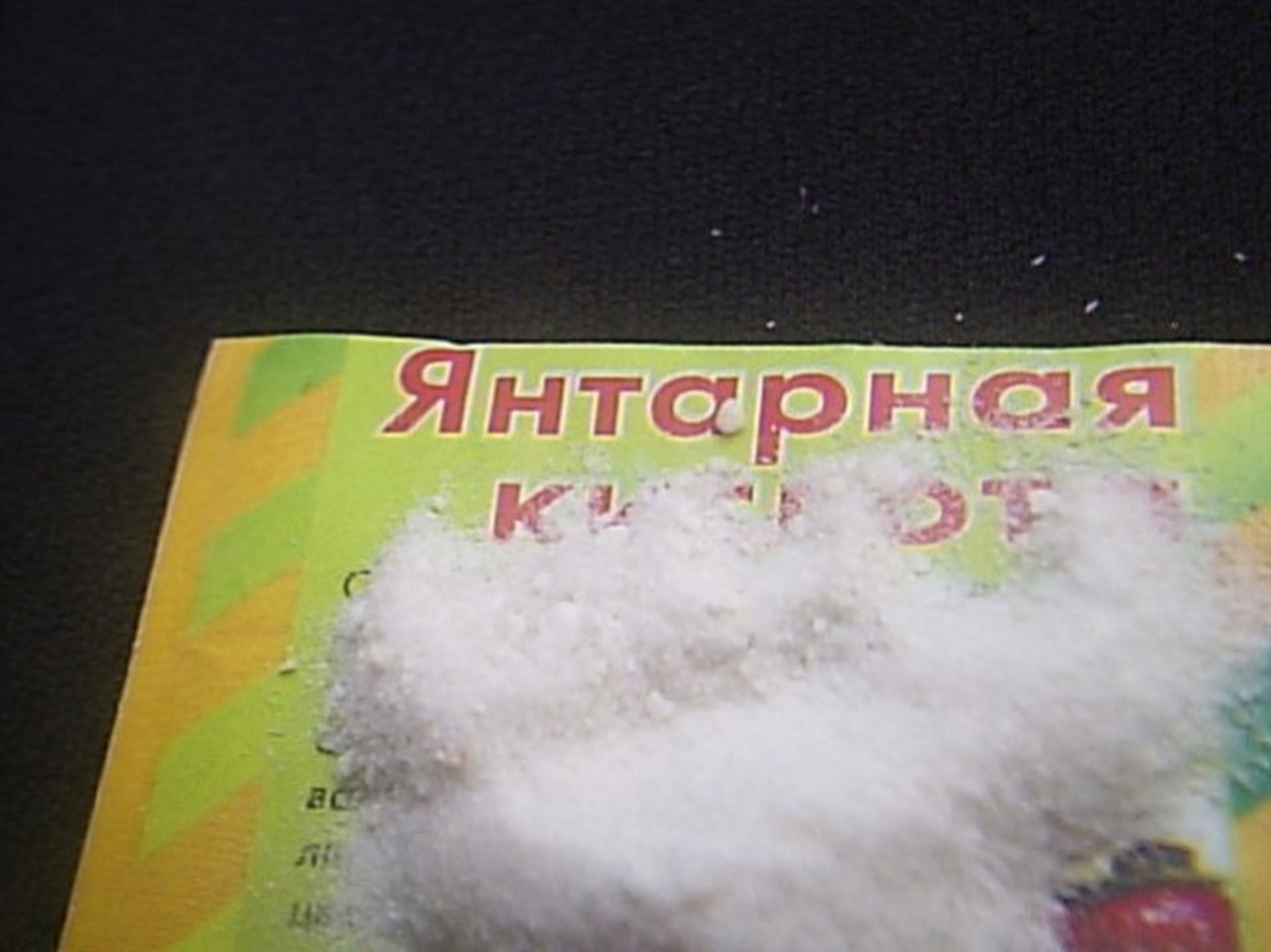 Янтарную кислоту также используют как удобрение. Она ускоряет созревание плодов, повышает урожайность, увеличивает содержание витаминов и сахара в плодах. Повышает холодостойкость, засухоустойчивость и сопротивляемость к заболеваниям. Применение таково: растворить 2 г янтарной кислоты при комнатной температуре в 1-2 литрах воды и замочить семена в течение суток, столько же держать в растворе черенки для улучшения корнеобразования. Растения, которые уже высажены в грунт, опрыскивают на 7-10-й день раствором: 2 г на 20 л воды. Плодоносящие насаждения опрыскивают до и после цветения и перед созреванием плодов. Картофель увлажняют перед посадкой, ботву опрыскивают перед цветением.